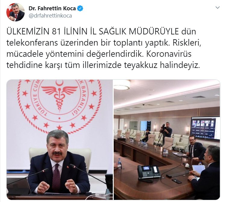 Sağlık Bakanı Koca yaptığı paylaşımda, “ÜLKEMİZİN 81 İLİNİN İL SAĞLIK MÜDÜRÜYLE dün telekonferans üzerinden bir toplantı yaptık. Riskleri, mücadele yöntemini değerlendirdik. Koronavirüs tehdidine karşı tüm illerimizde teyakkuz halindeyiz” ifadelerini kullandı.