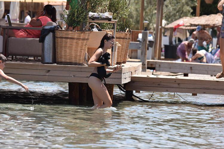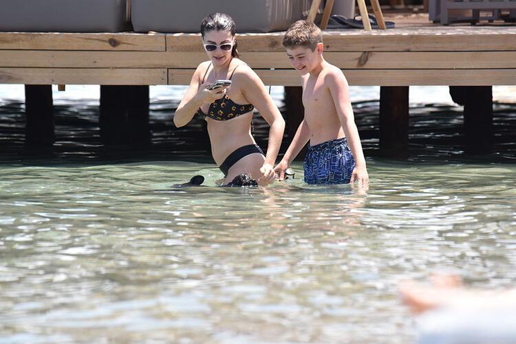 Çangu yüzerken cep telefonu ile fotoğraflarını çeken oyuncu sonra Can ile denize girdi. Birbirlerine su atıp şakalaştılar.