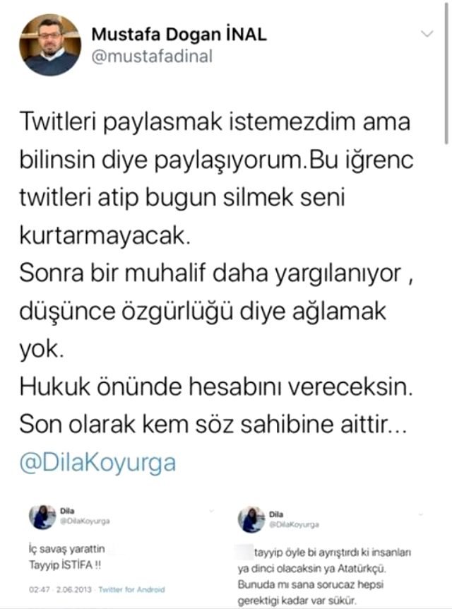 Cumhurbaşkanı ve AK Parti Genel Başkanı Recep Tayyip Erdoğan’ın avukatı Ahmet Özel, Cumhurbaşkanına hakaret ettiği gerekçesiyle CHP Gençlik Örgütleri İzmir İl Sekreteri ve Karabağlar Belediye Meclis Üyesi Dila Koyurga hakkında İzmir Cumhuriyet Başsavcılığı’na suç duyurusunda bulundu.