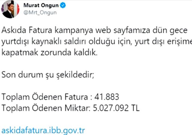 İBB Sözcüsü Murat Ongun, Askıda Fatura uygulamasının ödeme sistemine yurt dışı kaynaklı siber saldırı gerçekleştiğini duyurdu ve ”Yurt dışı erişime kapatmak zorunda kaldık” dedi. Öte yandan uygulama kapsamında şu ana kadar toplam bedeli 5 milyon lirayı aşan 41 bin 883 fatura ödendi.