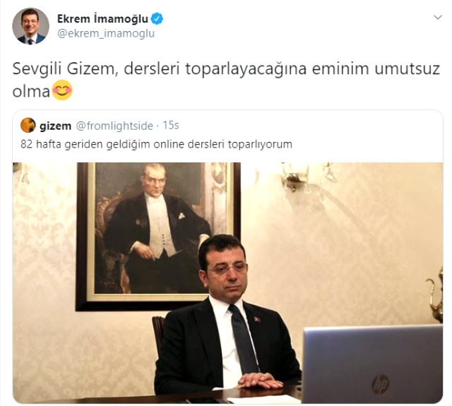 Adı Gizem olan “fromlightside” isimli Twitter kullanıcısı, uzaktan eğitim dersleriyle ilgili İBB Başkanı Ekrem İmamoğlu’nun gülmediği bir fotoğrafını paylaşıp “82 hafta geriden geldiğim online dersleri toparlıyorum” yazdı.