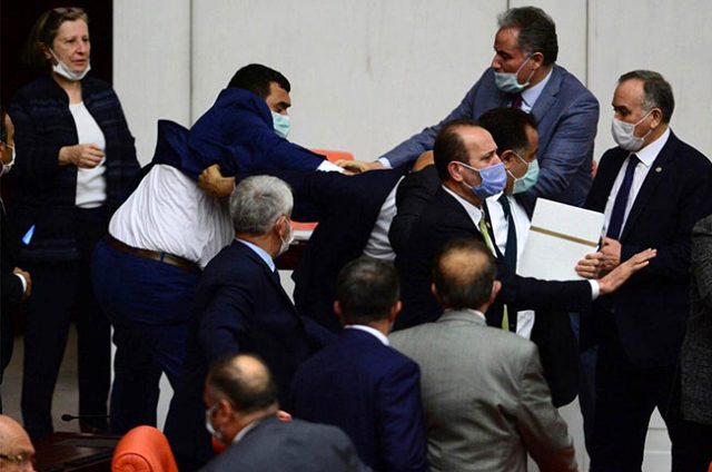 Önceki gün TBMM’deki oturumda CHP’li vekiller Enis Berberoğlu’nun vekilliğinin düşürülmesini protesto amacıyla yavaş oy kullanma eylemi yaptı. MHP Lideri Devlet Bahçeli’yi beklettikleri gerekçesiyle bu duruma tepki gösteren MHP Milletvekili Olcay Kılavuz ile CHP’li Özgür Özel arasındaki tartışma, bir anda yumruklu kavgaya dönüştü. Olayın yankıları sürerken MHP’li Kılavuz’un Özel’e yumruk attığı anın görüntüsü de ortaya çıktı.